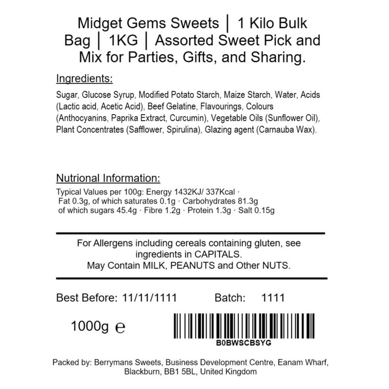 Berrymans Midget Gems  1 Kilo Bulk Bag  1KG  Assorted Sweet Pick and Mix for Parties, Gifts, and Sharing.