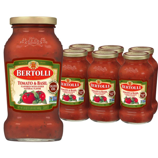 - Six 24 oz jars of Bertolli Pasta Sauce with Tomato and Basil, Spaghetti Tomato Sauce