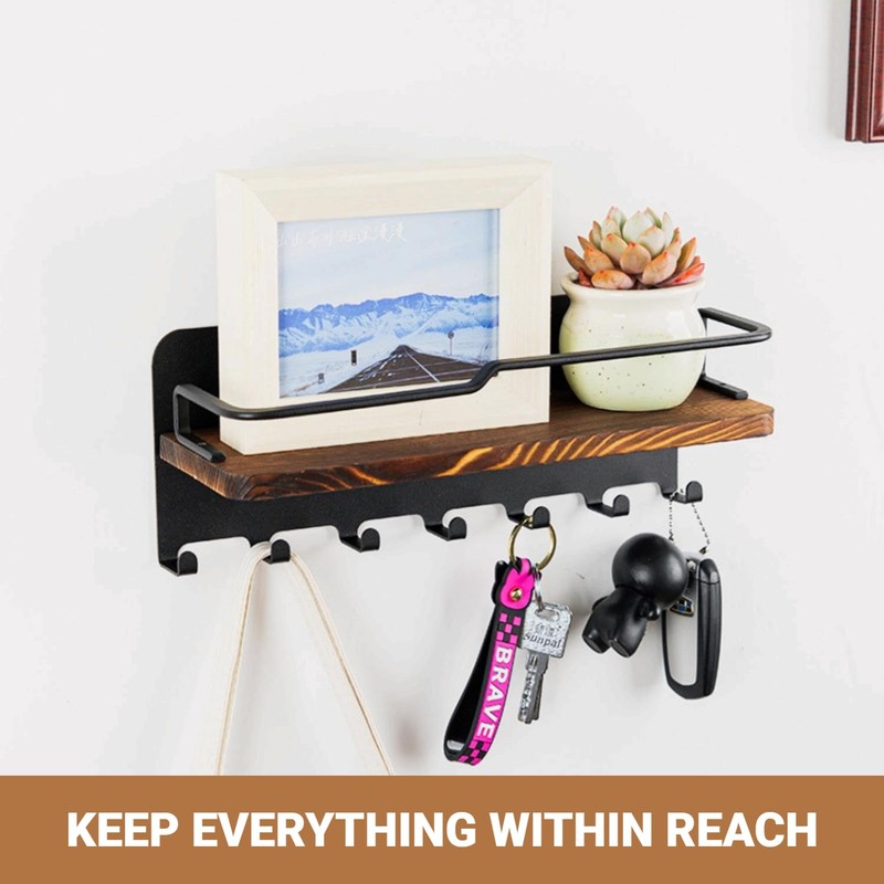 - MULTI-FUNCTION STORAGE: The key holder with shelf and 7 hooks provides you with more storage space, allowing you to easily store small items such as keys, wallets, handbags, umbrellas, pet leashes, etc., or use it to display your treasured photos and decorations.