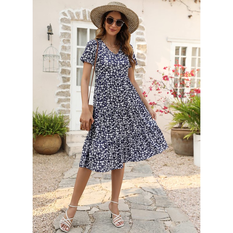 - Womens Casual Boho Summer Dresses 2025 Sexy V-neck Short Sleeve Tiered Midi Dress Floral Dress for Women Loose Fit A-line Empire Waist Cotton Black Dresses for Women Ruffle Babydoll Flowy Dresses for Women Wedding Party Summer Sundress Beach Dresses