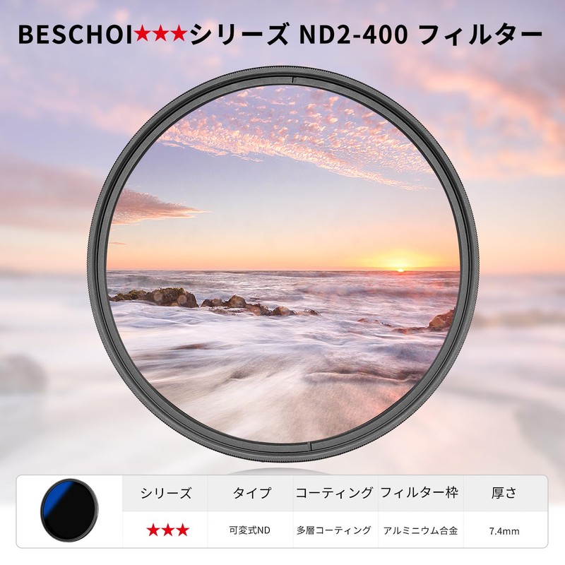 - 【Variable ND Filter】Beschoi ND2-ND400 variable filter reduces light reaching the camera sensor, slows shutter speed and allows for larger aperture. Ideal for rivers, waterfalls, light spots and moving optical shots with dynamic motion blur