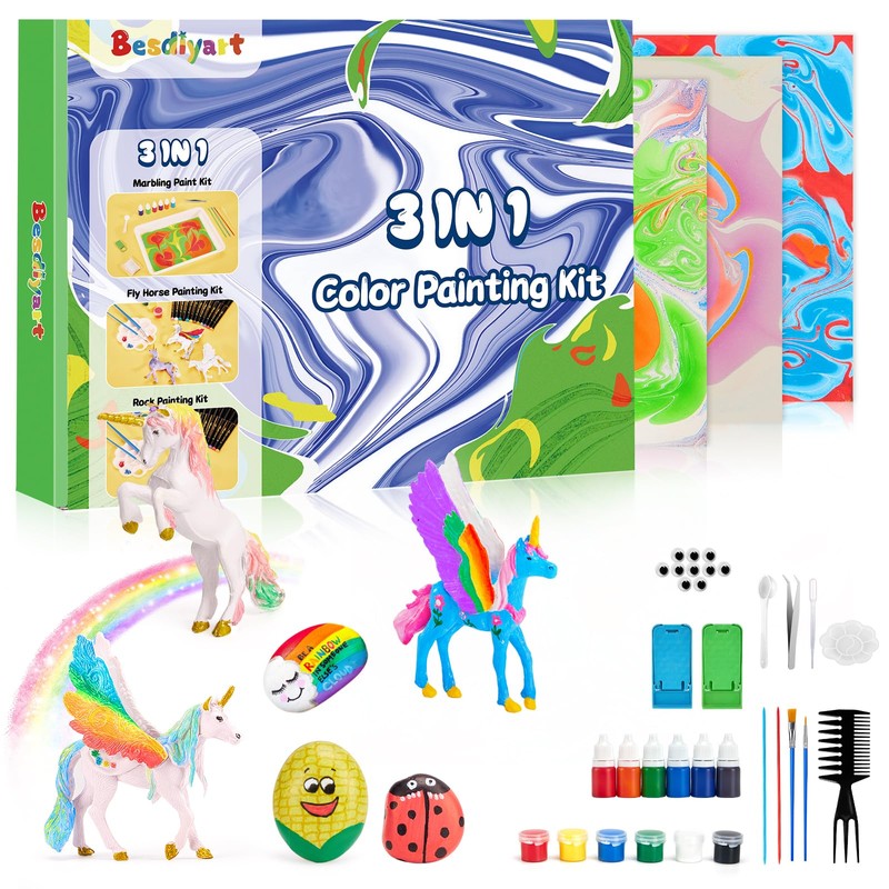 Besdiyart Water Marbling Paint, Unicorn Painting Set and Stones Painting Set for Children, Craft Sets, Creative Art and Craft Set for Boys and Girls as a Gift, 3-in-1 Painting Set for Children
