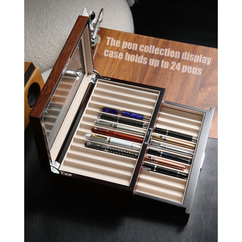 - The pen collection display case holds up to 24 pens .The pen storage has two finishes, black and dark brown, to suit numerous interior styles.wood pen display are designed to store your precious pen or for a growing collection that allows you to proudly display and organize your favorite pens and accessories.Tastefully protects, stores, and organizes up to 24 of your pens.Luxury pen box with a glass window.You'll love looking at your collection of pens neatly displayed in this fine box.