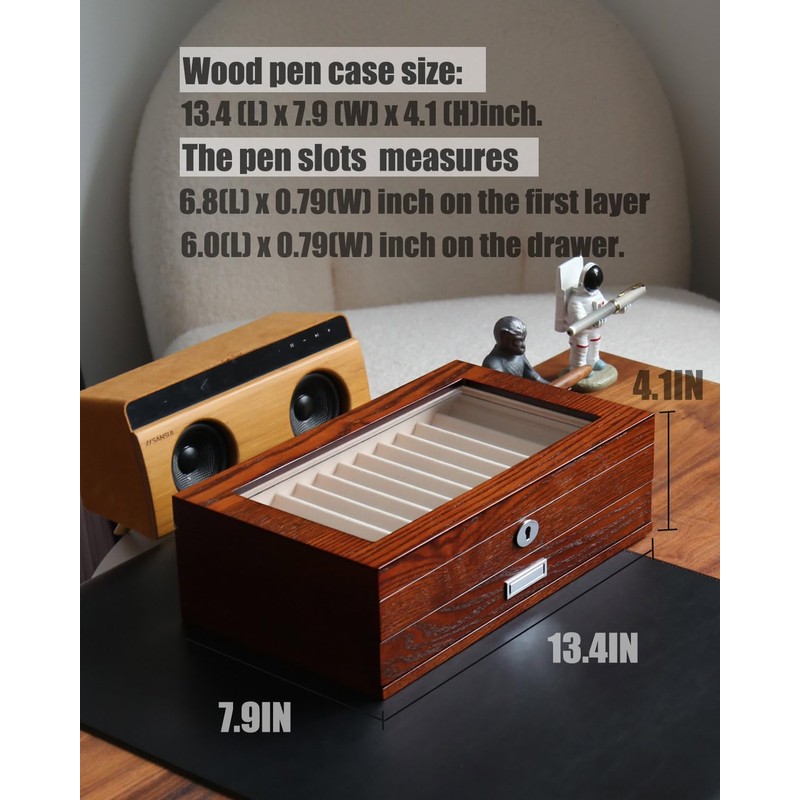 - The size is 13.4(L) x 7.9(W) x 4.1(H) inch, Grid size of the first layer is 6.8(L) x 0.79(W) inch,drawer grid size is 6(L) x 0.79(W), The top layer with lock can holds 12 pens and the drawer can collection 12 pens too. Pen box can accommodate various types of pens, including fountain pens, ballpoint pens, and pen sets.You can organize your pens in the box according to your personal preferences and collection needs, whether by size, color, or personal preference.