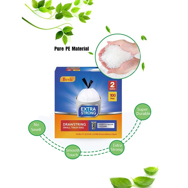 - 【Eco-friendly & No Smell】Besli 2 gallon trash bag is made of high quality pure HDPE material. Good toughness, tensile resistance, environmentally friendly and no odor, safe for daily use.