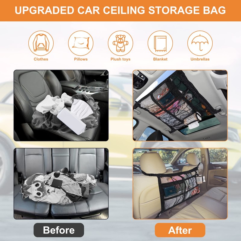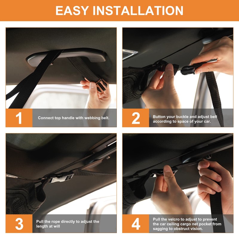 - Easy Installation: The car ceiling cargo net comes with 4 durable fixing buckles, making installation simple and secure in vehicles with 4 handles