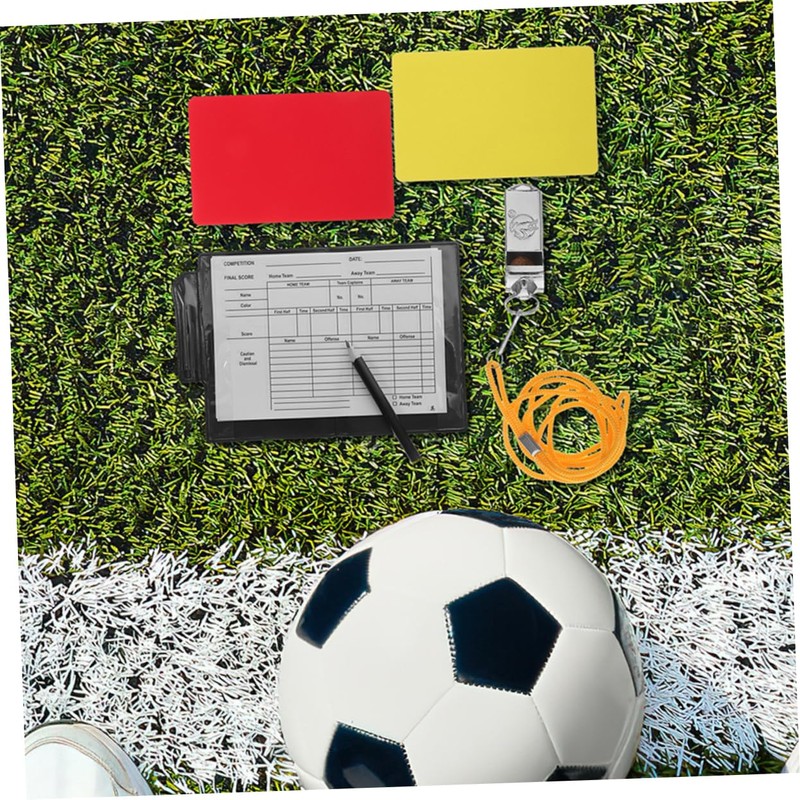 -A complete referee kit for soccer matches, including red and yellow cards, a pen, a notepad, and two metal whistles referee card.