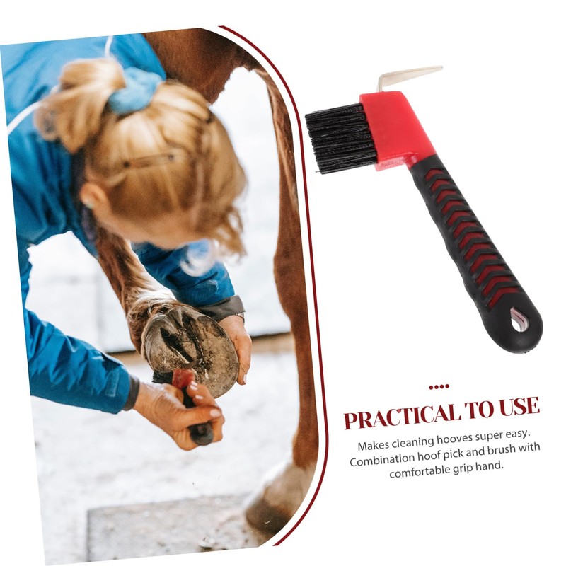 scraper tool Makes cleaning hooves super easy.janitorial supplies Combination hoof pick and brush with comfortable grip hand.horse treats This Hoof Pick is made of stainless steel.esthetician It has a durable nylon bristle brush and features a rubberized grip handle for extra grip as well as comfort