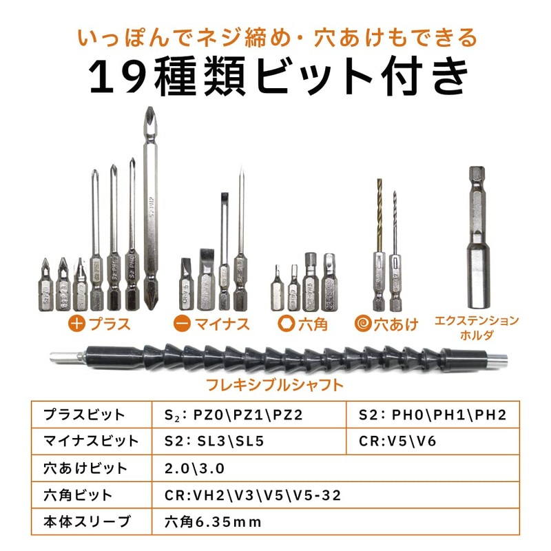 Flexible shaft x 1, Extension holder x 1, 17 different bits: