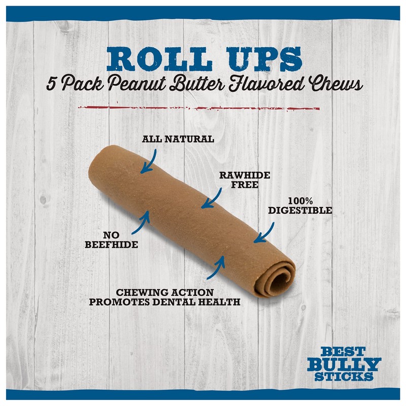 Best Bully Sticks Roll Ups are made with all-natural ingredients and are never chemically processed. Made with delicious peanut butter flavor, every dog’s favorite flavor, these chews are perfect for dogs with protein or meat sensitivities.