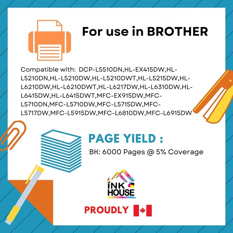 - Compatible with: DCP-L5510DN,HL-EX415DW,HL-L5210DN,HL-L5210DW,HL-L5210DWT,HL-L5215DW,HL-L6210DW,HL-L6210DWT,HL-L6217DW,HL-L6310DW,HL-L6415DW,HL-L6415DWT,MFC-EX915DW,MFC-L5710DN,MFC-L5710DW,MFC-L5715DW,MFC-L5717DW,MFC-L5915DW,MFC-L6810DW,MFC-L6915DW