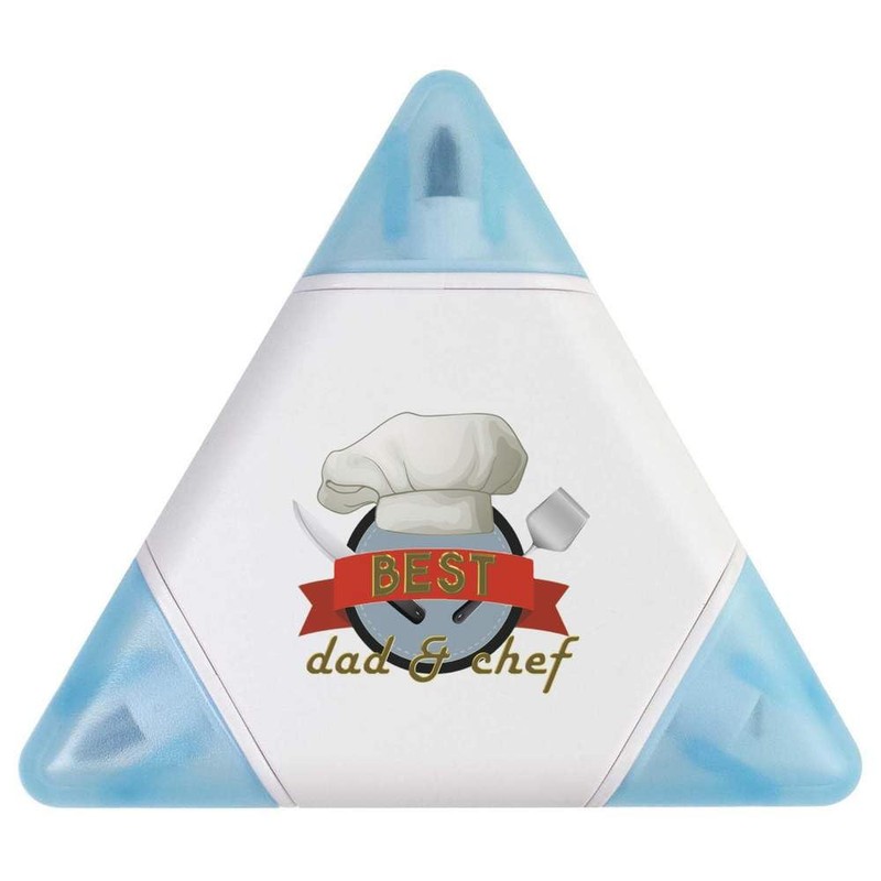 Our triangular compact multi tool is printed on one side with a unique design, making it a great gift for DIY lovers. This 3-in-1 tool set contains a tape measure and 2 different screwdriver attachments and each corner has a snap shut lid. One corner reveals a 1 meter tape measure, while the others hide two reversible screwdriver attachments, one larger and one smaller, both of which have a cross head on one end and a flat head on the other.