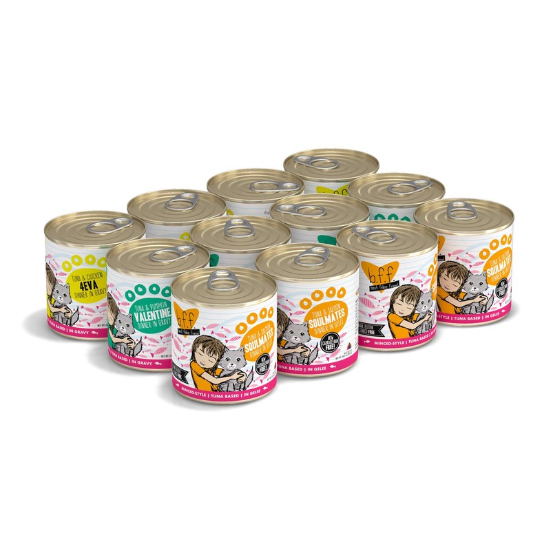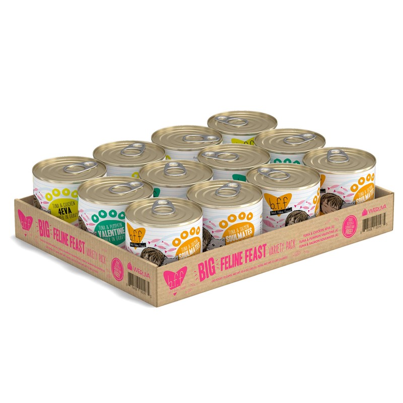 Big Feline Feast, a Variety Pack – 12 pack of 10oz wet canned cat foods, including Tuna & Chicken 4 Eva, Tuna & Pumpkin Valentine and Tuna & Salmon Soulmates (4 of each 10oz can). A palate-pleasing selection of our most popular grain-free B.F.F recipes in bigger cans - great for multi-cat homes and finicky felines! B.F.F. by Weruva - For your Best Feline Friend!