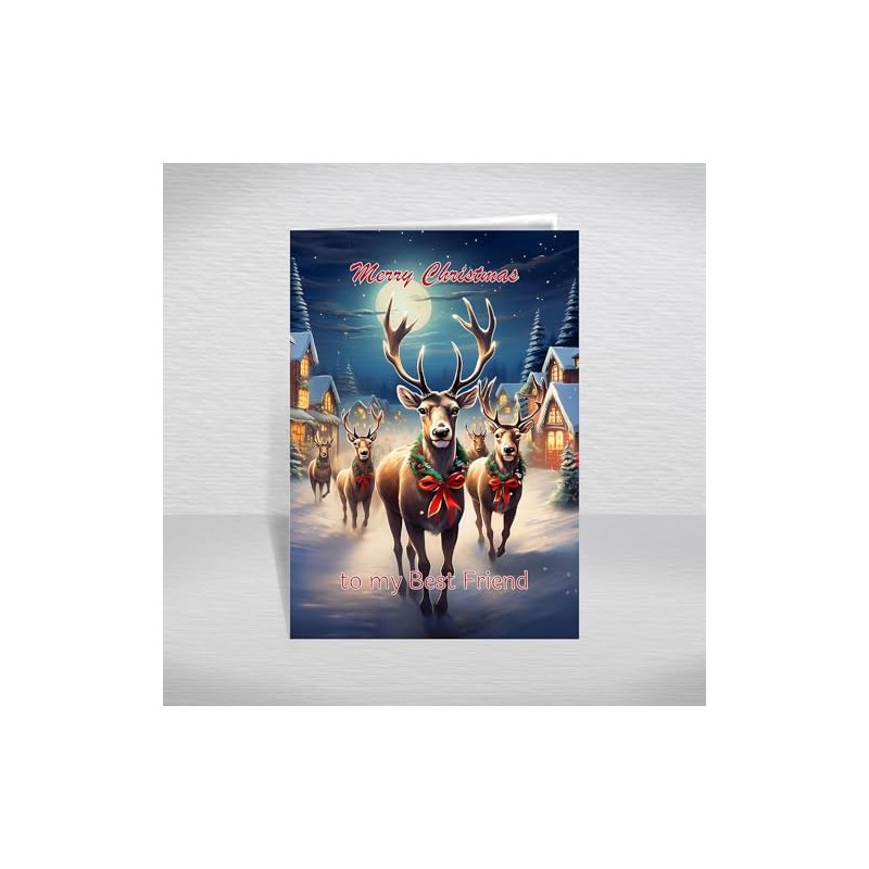 The front features a picturesque snowy village scene with a herd of reindeer beneath a starlit night sky, perfectly capturing the spirit of Christmas. The front of the card features the greeting: "Merry Christmas to a my Best Friend" adding a timeless, joyful touch.