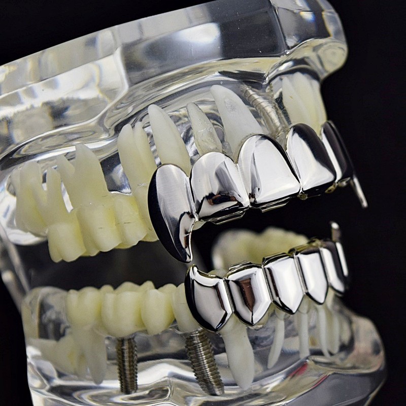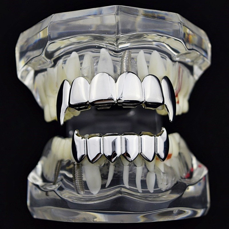 Best Grillz Full Fangs Set Silver Tone Plain Top and Bottom Hip Hop Dracula Vampire Fang Teeth