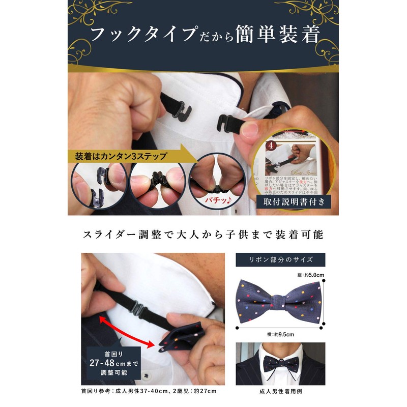 - The bow tie cannot be tied properly in one time if you try to tie it yourself. This is a one-touch bow tie with a butterfly part that is sewn with thread and secured with a hook. Even those who are not familiar with the ease of installation