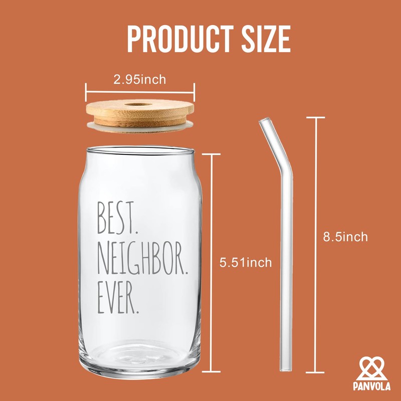 Best Neighbor Ever Neighbor Gifts Glass Can with Bamboo Lid and Straw Housewarming Gifts Glass Cup Iced Coffee Glasses Beer Can Shaped Drinking Glasses Drinking Jars 16 oz