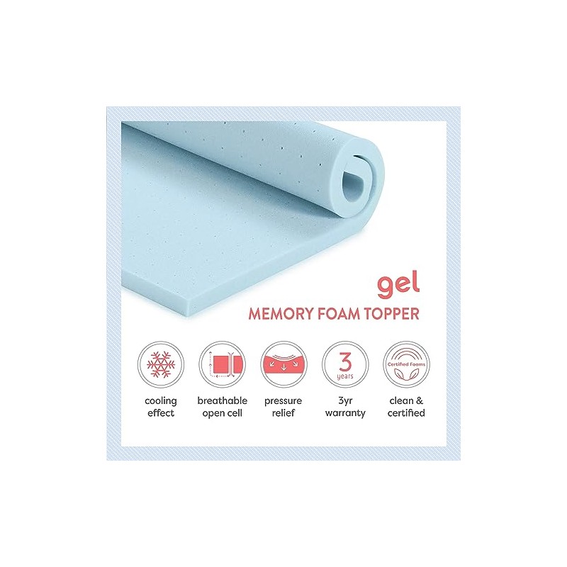 Best Price Mattress ' 2-inch gel memory foam toppers are the perfect addition to your sleep routine and an easy way to instantly upgrade your mattress. The gel-infused ventilated topper is one of our innovative mattress enhancers and a top-rated favorite with compact packaging and delivery straight to your door. Gel infusion in the memory foam provides cooling benefits and helps mediate against trapped heat as you sleep. Body-conforming memory foam relieves pressure points throughout your body, adding a layer of support and comfort to any mattress. Memory foam is also known for its low motion transfer that helps provide both you and your partner undisturbed sleep. Our topper is also thoughtfully designed to be one inch narrower and one inch shorter than standard bed sizes for a perfect fit with your standard-sized sheets (topper cover not included).