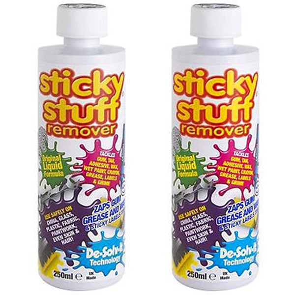 Sticky Stuff Remover's unique formulation is designed to tackle 'icky sticky' messes on most surfaces^Tackles stains such as: chewing gum, sticky labels, grease, tar, glue, wax, wet paint, crayon and much more^Can be used on most surfaces including: glass, plastic, fabrics, metal, worktops and many more