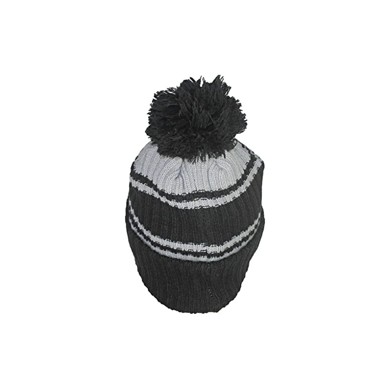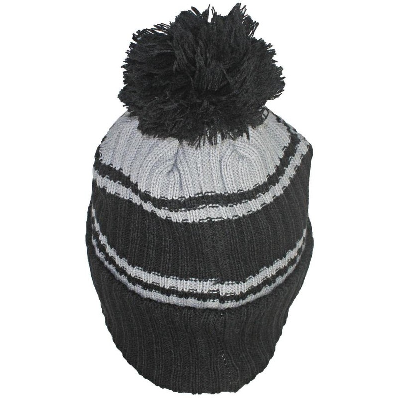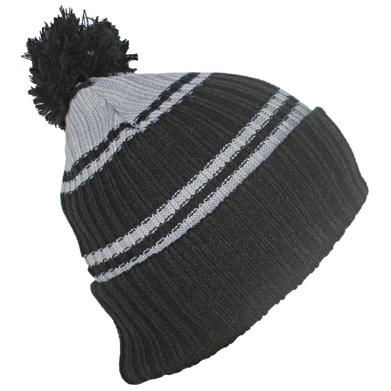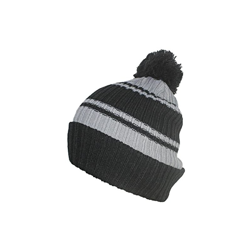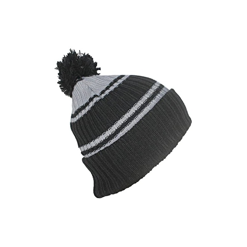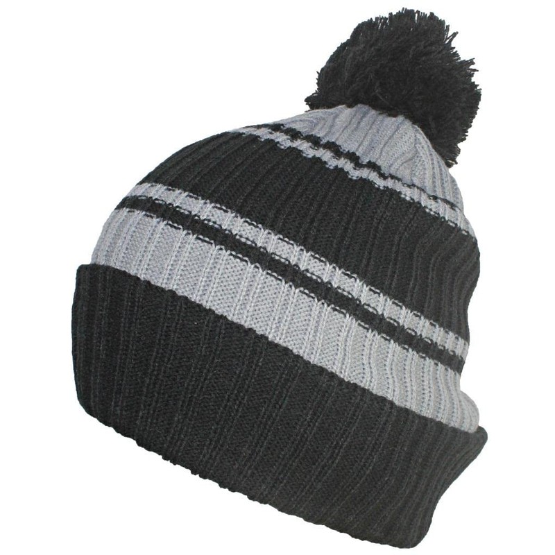 Best Winter Hats Quality Striped Beanie with Solid Cuff & Matching Pom - Black/Gray