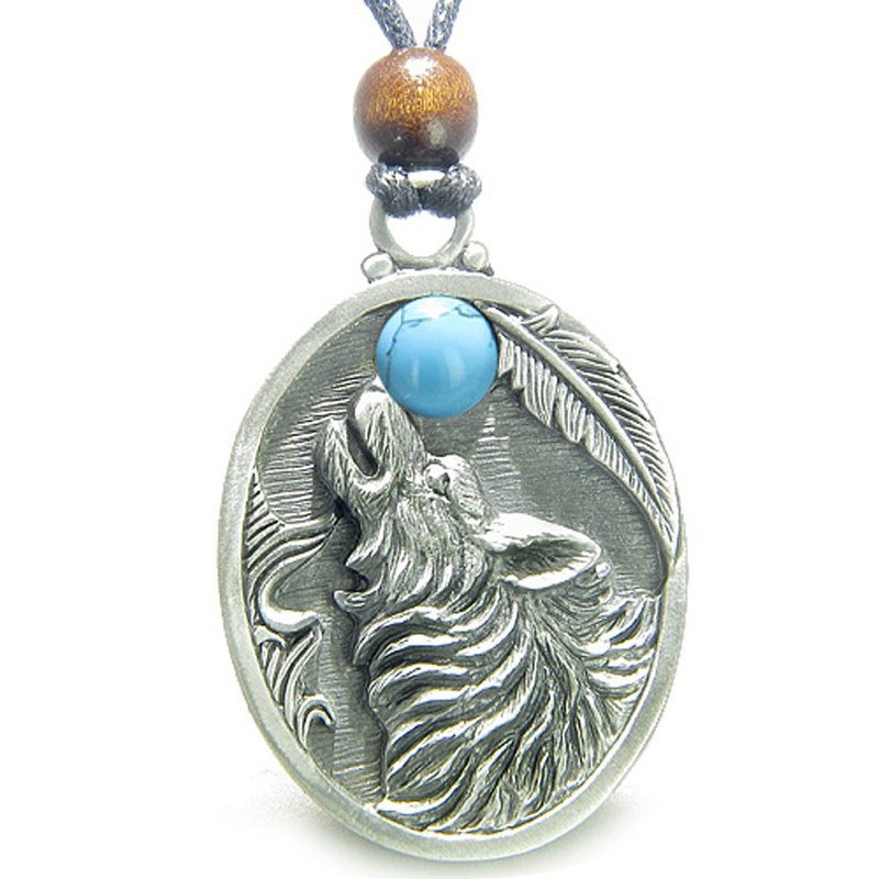 - Best Amulets Collection. Amulet Howling Wolf and Simulated Turquoise Moon Crystal Oval Shape Base Lucky Charm Pendant on Adjustable Cord NecklaceAmulet Howling Wolf Simulated Turquoise Moon Lucky Charm Pendant Necklace