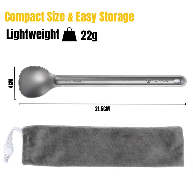 - Ultralight titanium spoon: made of high-quality titanium, camping spoon is not only extremely light, but also incredibly robust and corrosion resistant - perfect for long-term outdoor use.