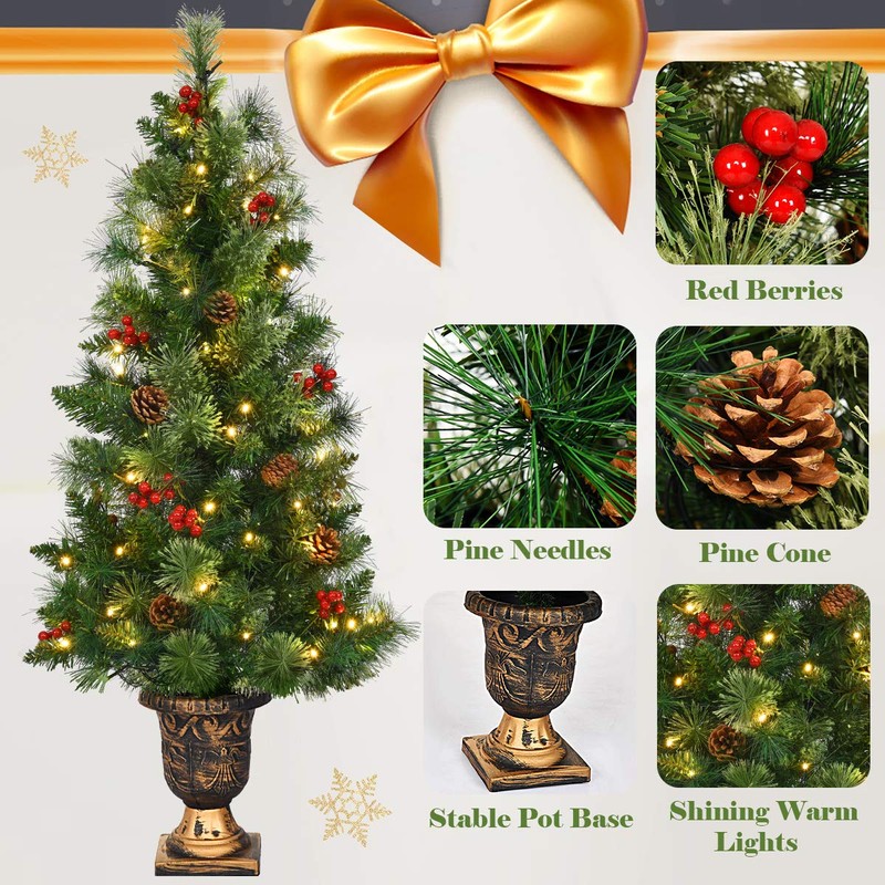 BestComfort 3ft Pre-lit Artificial Christmas Tree for Entrance, 40 Led Lights, Pine Cones and Red Berries (3 ft)