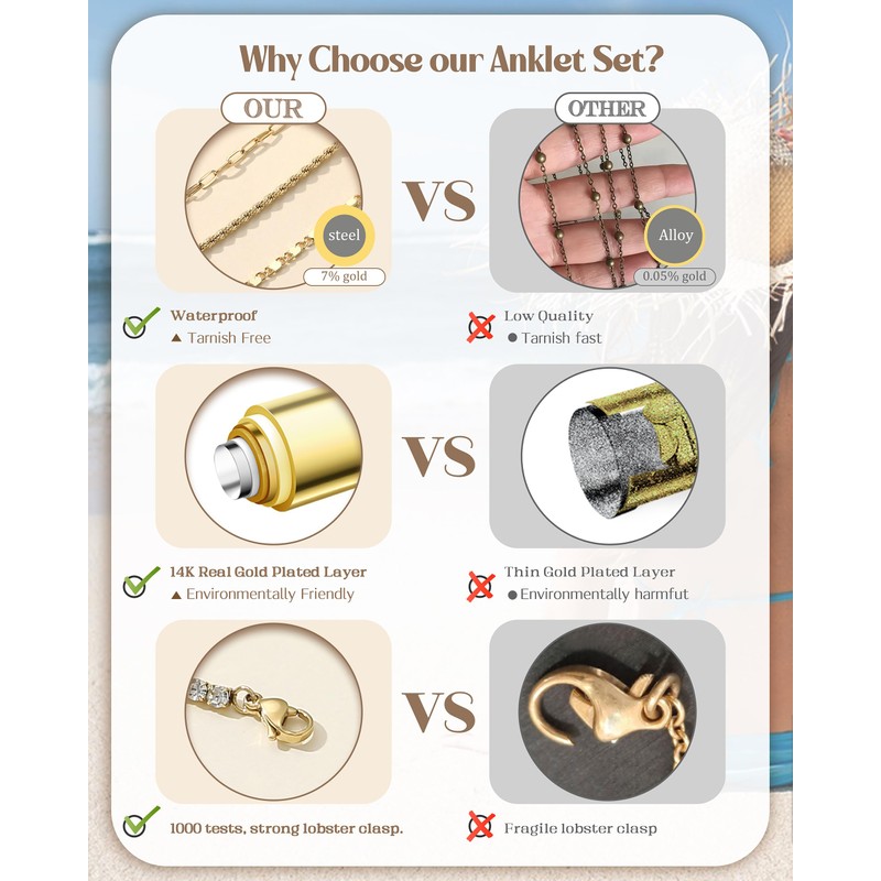 - Comfort & Durability Women Anklets--Hypoallergenic stainless steel anklet ensures irritation-free wear for sensitive skin. Unlike plated brass jewelry, our non tarnish anklet maintains color integrity through sweat, humidity, and water exposure. Lightweight design stays comfortable for 24/7 wear