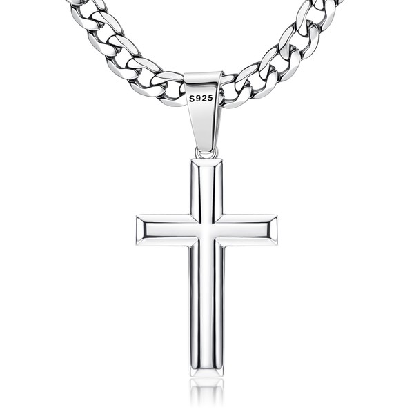 Besteel 925 Sterling Silver Cross Necklace for Men Women 5mm Big Beveled Edge Men's Stainless Steel Diamond Cut Curb Cuban Link Chain Crucifix Cross Pendant Jewelry 18 Inches