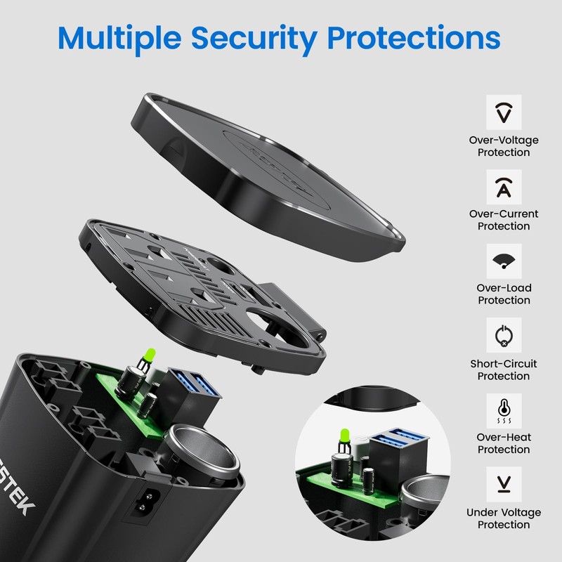 - 【Multi-protection】The car inverter has a built-in 25A/32V fuse, and the upgraded automatic shutdown function will trigger in the event of overvoltage, undervoltage, overload, overcurrent, overheating, etc., which can better protect your equipment and car safety (suitable for 12V cars , but not for 24V).