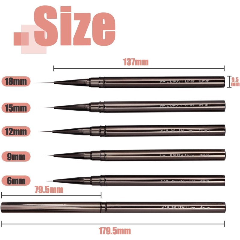 - Complete set 76/9/12/15/18 mm nail art liner brush set can achieve the tiny details and fine lines needed to draw nail designs.