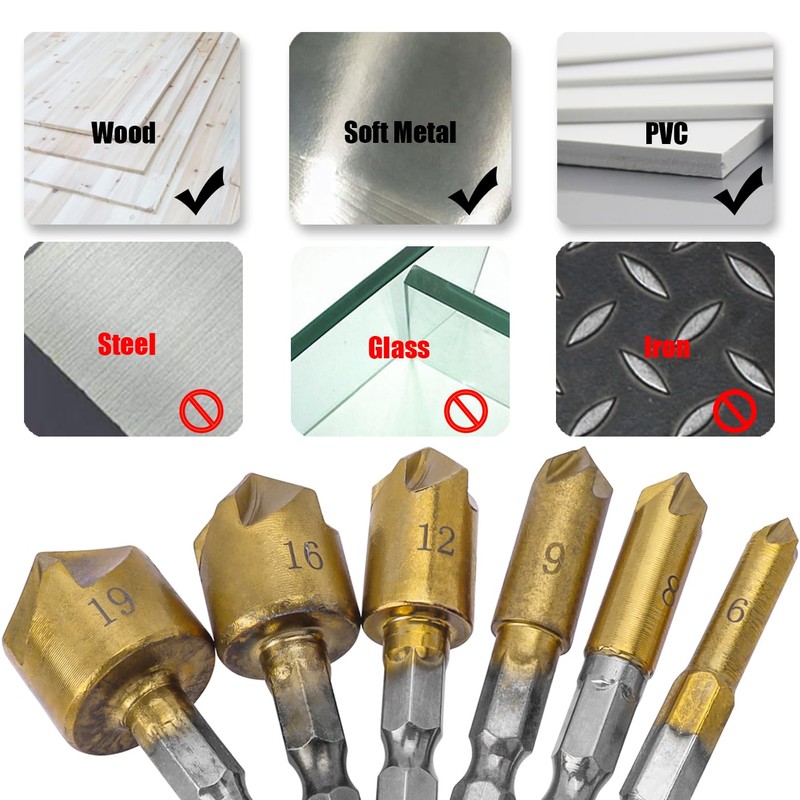 - Complete Size - Our counter sink drill bits sets including 6mm(1/4''), 8mm(5/16''), 9mm(3/8''), 12mm(1/2''), 16mm(5/8''), 19mm(3/4'') to meet your different use needs.