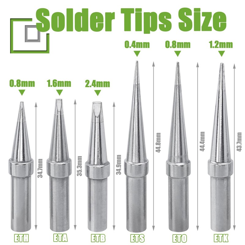 - 6 different shapes and sizes of soldering tips (ETA ETB ETH ETK ETO ETS), offering flexibility for various soldering tasks and projects.