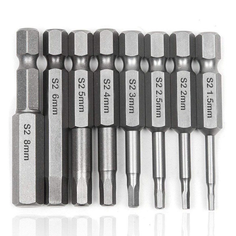 Professional Size: 8Pcs Metric Hex Bits H1.5, H2, H2.5, H3, H4, H5, H6, H8. Total Length: 50mm.