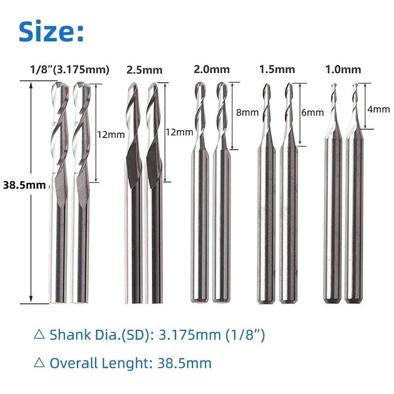 - Shank: 3.175mm (1/8"); Overall length: 38mm; Size: 1mm/ 1.5mm/ 2mm/ 2.5mm/ 3.175mm.