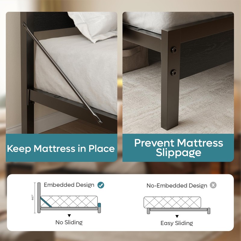 - 【Prevent Mattress Slippage & High Headboard Design】 Unlike other bed frames, The queen size bed frames with headboard features diagonal stops to keep mattress in place. The 44-inch high headboard offers a comfortable backrest and two side pockets for added convenience