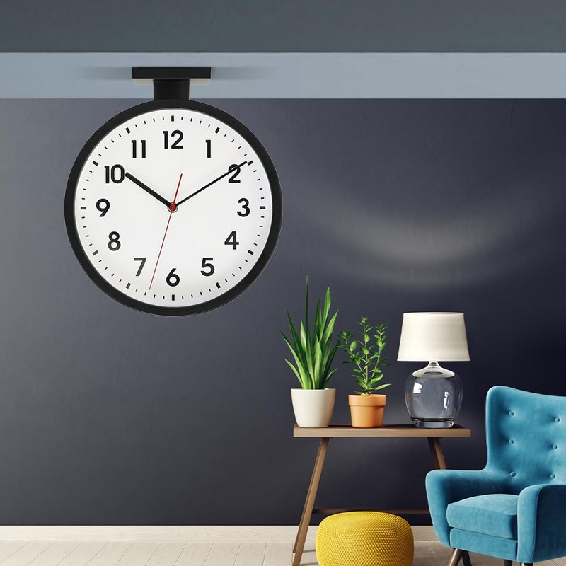 - The double-sided wall clock is made of aluminum material. The sturdy frame and glass lens are easy to clean and prevent dust from entering the watch face. Easily read the time with black hands, glass crystal and light dial. Designed to hang from indoor walls or ceilings.