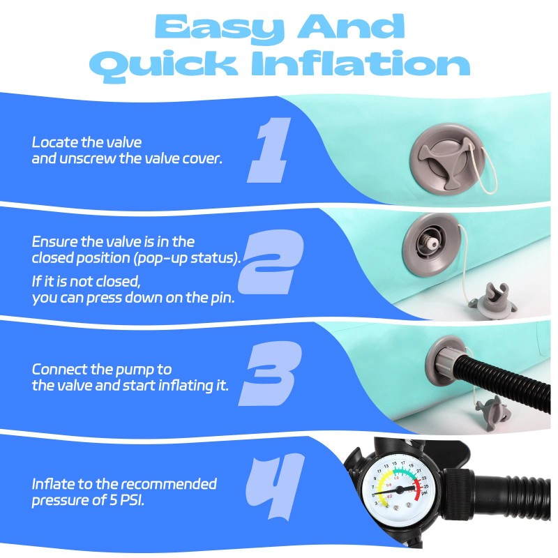 Quick Inflation and Deflation: The Water Hammock Floats for Adults comes with a hand pump. Inflating the float generally takes about 10 minutes and the recommended PSI is 5-7. Make sure to connect the hose to the appropriate end of the pump before use, as the pump has both inflation and deflation modes of operation