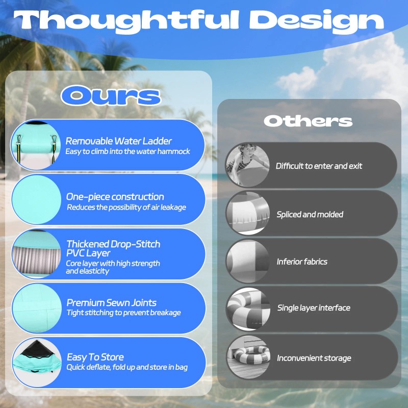 High Quality Materials: Water hammock utilizes drop-stitch technology, ensuring robustness and durability. Reinforced seams provide exceptional airtightness for the inflatable dock, while the PVC surface material offers superior durability and puncture resistance, contributing to an extended operational lifespan