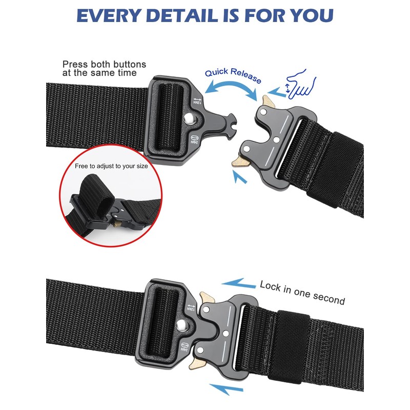 - Quick Release Metal Buckle - Sturdy metal buckle has a high load capacity and quick release, the intuitive and smooth quick release feature releases your belt in less than 1 second when you press the gold buckle at the same time. As soon as it is inserted, it is attached and stays in place without slipping, providing you with maximum comfort.