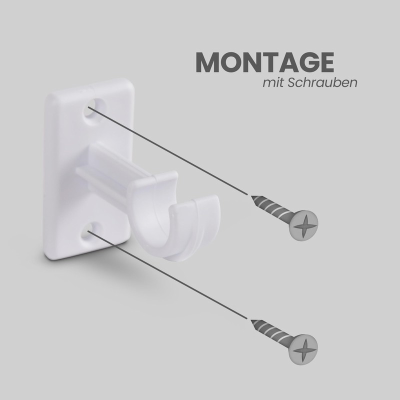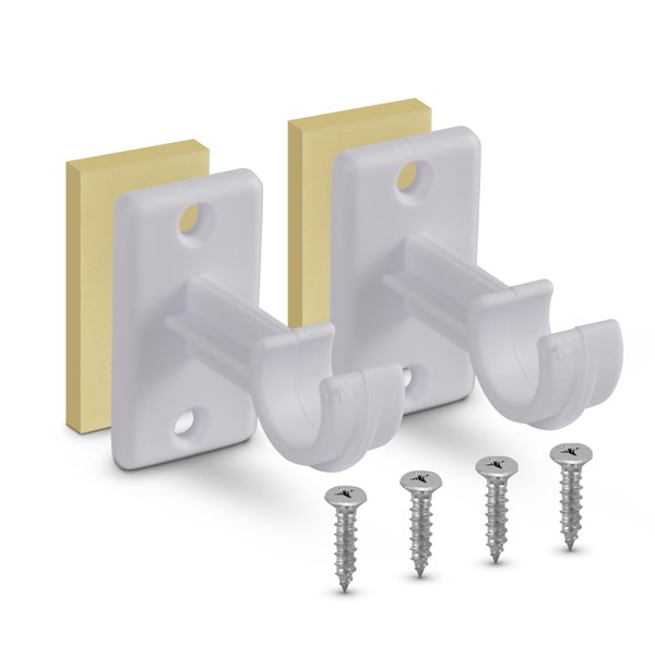 Supports for cafe curtain rods for glueing or for screws; includes screws, adhesive pads and installation manual (English language not guaranteed).