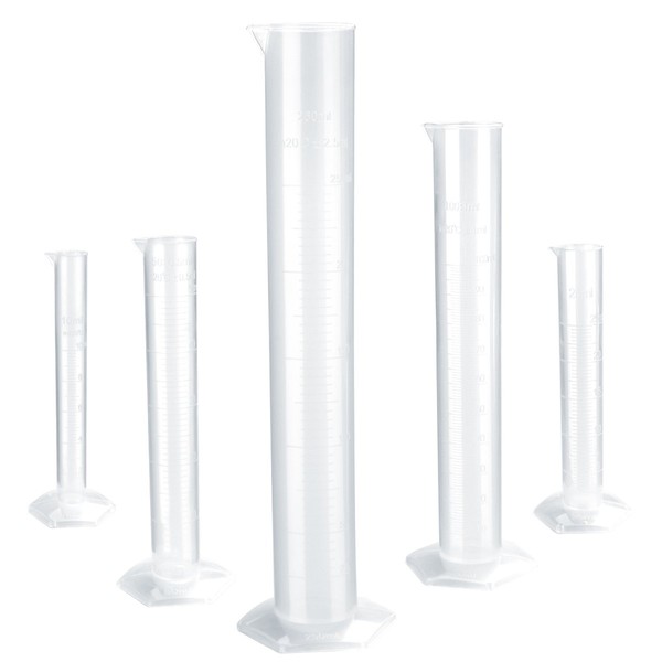 The item includes a set of 5 graduated measuring cylinders including a 10 ml, a 25 ml, a 50 ml, a 100 ml and a 250 ml, which is mainly made of durable hard plastic material for safe use and features a wide rim and a tapered spout for easy filling and pouring. The non-wetting inner surfaces concave meniscus are eliminated and provide accurate measurements.