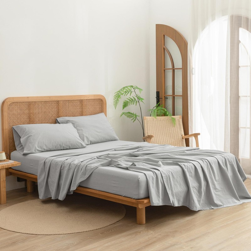 Material: 100% washed cotton, breathable and cool, durable and lightweight, slightly wrinkled look, great linen feel. If you want a linen style bedding, this sheet & pillowcase set is beautiful and perfect! The fabric is so soft yet with a very light crispness to it, even after washing, and it will get softer with each wash. It's like sleeping in a cloud. Design: Simple classic solid northern droplet grey, working with any bedding. Pillowcase is straight, the end is not sealed edge, simple and clean, easy to remove and wash. Twin Size Bed Sheet Set(3Pcs) Includes: 1 Flat Sheet (66 x 96 inch); 1 Fitted Sheet (39 x 75 + 17 inch deep pocket) ; 1 Pillowcases (20 x 30 inch). Deep Pocket and Easy Fit: The fitted sheet fit mattresses up to about 17 inches deep. If you have a mattress that is less than 17 inches, it will fit fine. The sheet has perfect elasticity and thickness all around, with an elastic band around the edge to ensure a secure fit and won't shift while you sleep. Care instruction: Machine wash cold; Do not bleach; Tumble dry with gentle cycle; Warm iron if needed.