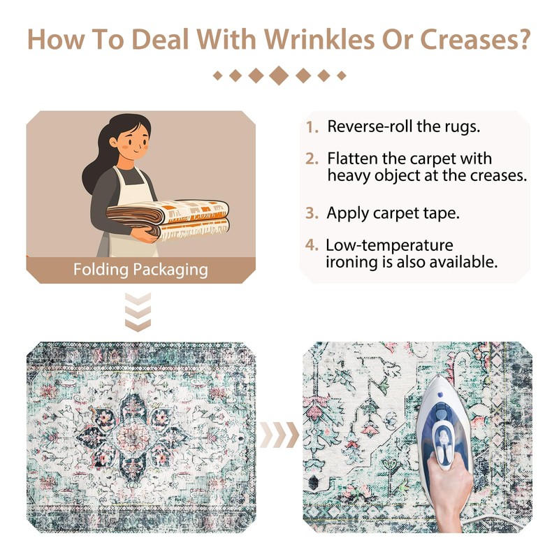 - Carpets are transported after being folded. If you just receive the Rugs, the carpet will have creases, normal laying 3 to 5 days creases will disappear, or you can also fold the carpet in reverse and leave it for a few days to eliminate wrinkles, or place a heavy object above the creases to flatten them.