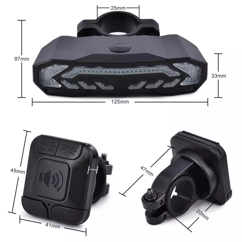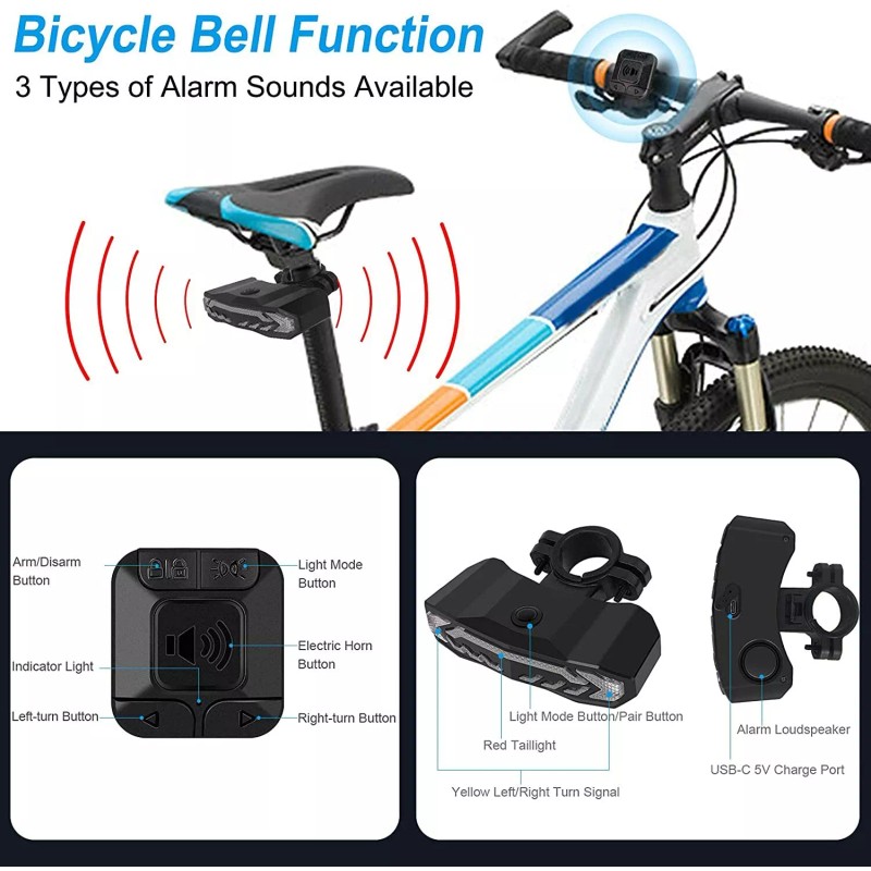 Anti-theft Alarm-Anti-theft tail light can be used as a bike alarm. if the alarm taillight detected vibration, it will sound a warning for 2 seconds; if it detected vibration again within 2-12 seconds, the alarm taillight will sound for 30 seconds to scare off the thief (multiple sounds loop). The Remote control also can be used as a bike electric horn