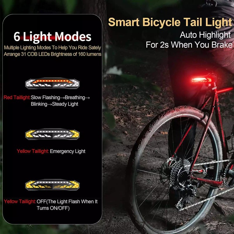 ULTRA-BRIGHT BICYCLE REAR LIGHT WITH 6 MODES - Super bright and extra-wide bike taillights with 31 high-end LED lights, up to 160 lumens of powerful flashes alert motorists at night and during the day, that enhance your visibility and safety. Slow Flashing\Breathing\Fast Blinking\Steady Light\Emergency Light\OFF, 6 light modes easily selected by remote