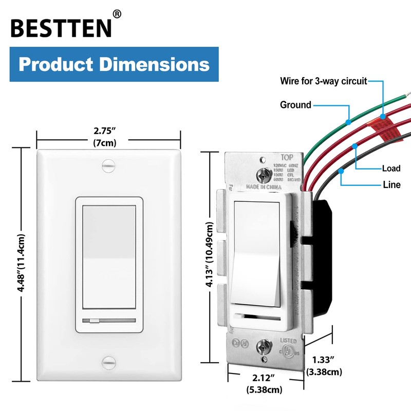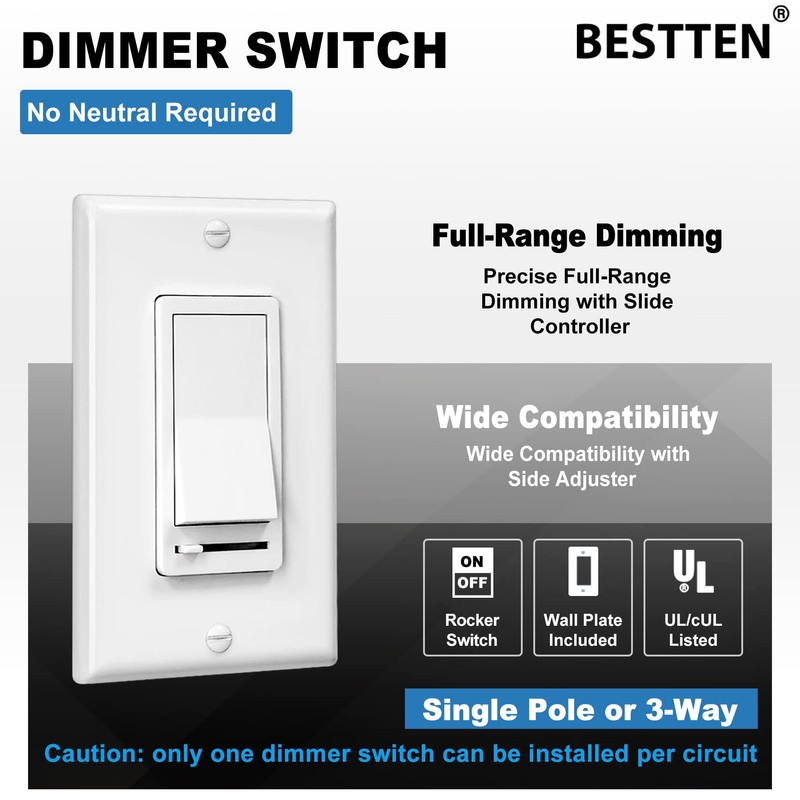 BESTTEN [10 Pack] Dimmer Light Switch, Single-Pole or 3-Way Dimmer Switches, 120V, Compatible with Dimmable LED, CFL, Incandescent and Halogen Bulbs, Decorator Wallplate Included, UL Listed, White