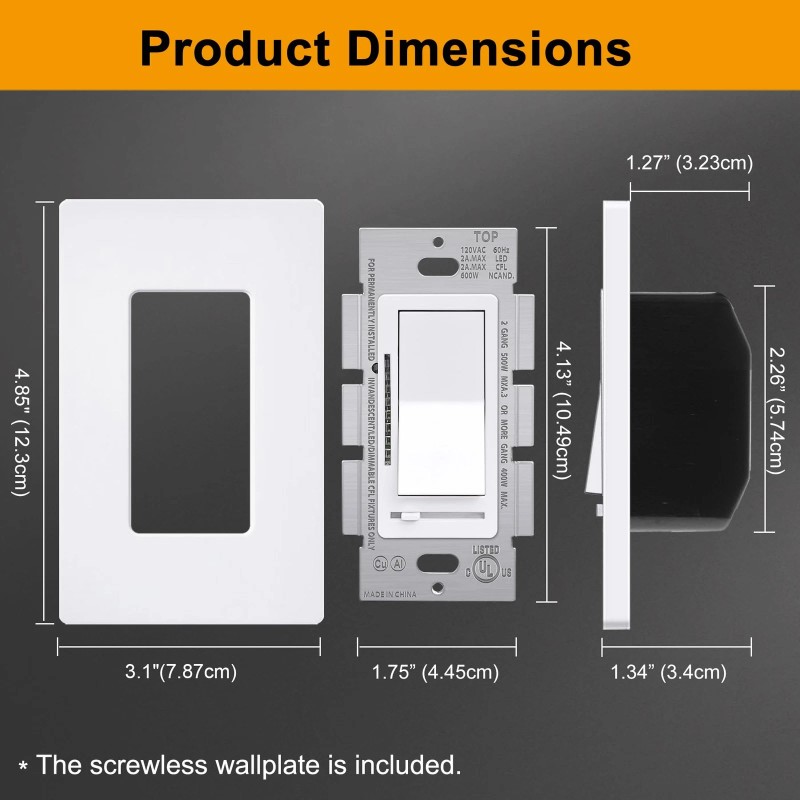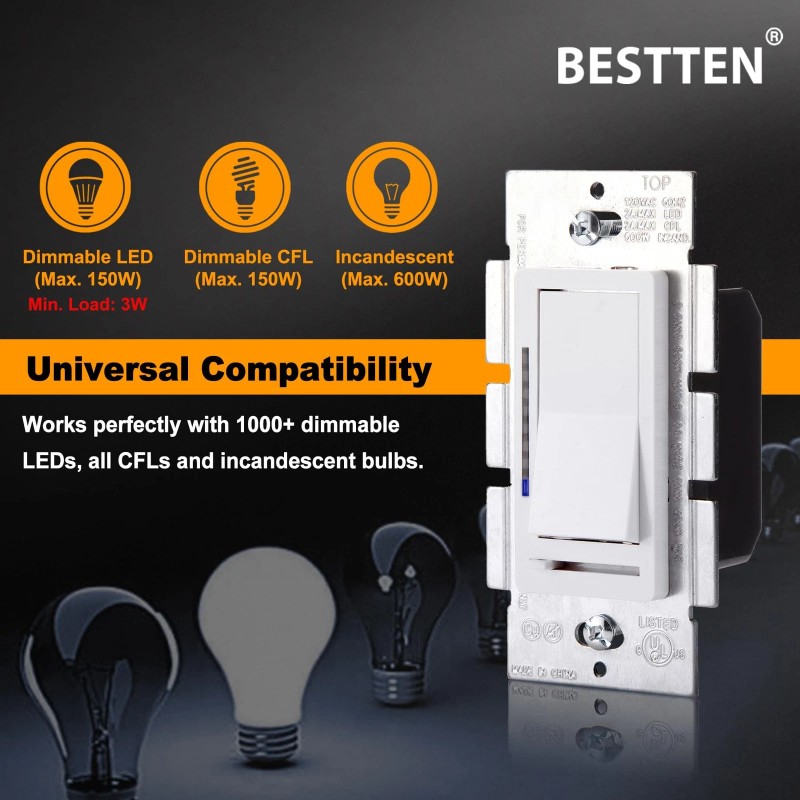 【Easy to install】 Easy to install in a single-pole or 3-way application. Wallplate, mounting screws and user manual included. Caution: only 1 dimmer switch can be installed in a 3-way circuit. Can not control fans