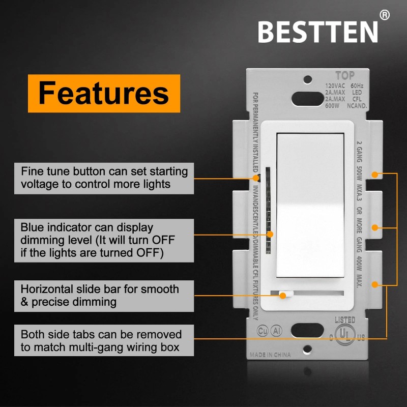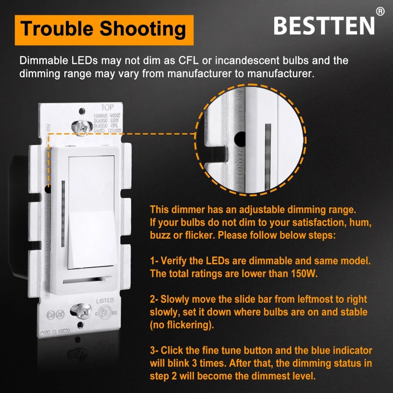 【Wider Compatibility】 Fine tune button behind the wall plate on left side can adjust the minimum light level in order to maximize the dimming range and eliminate flickering
