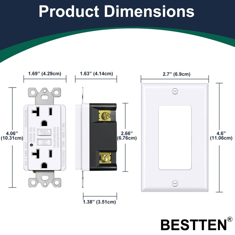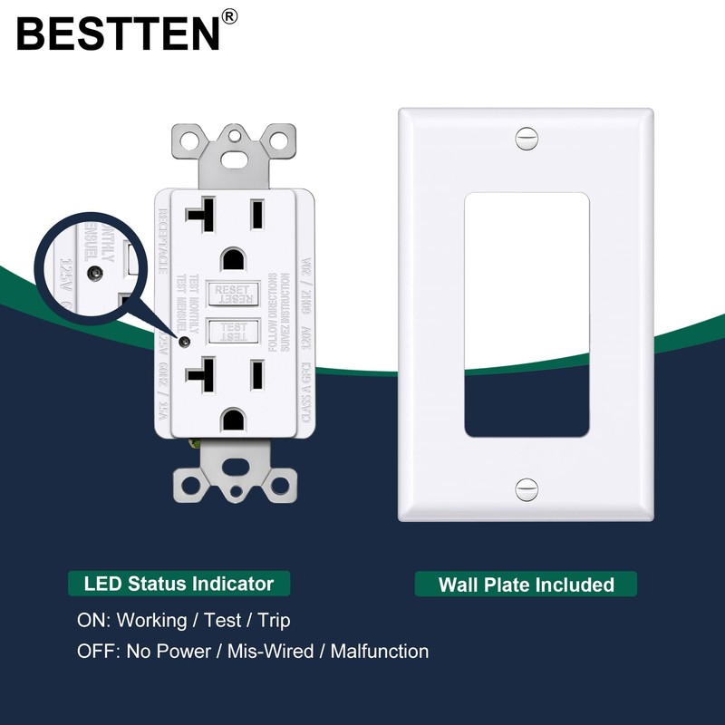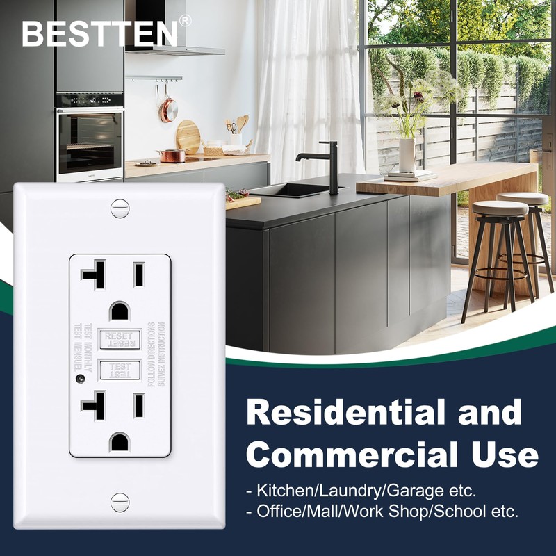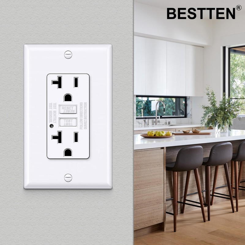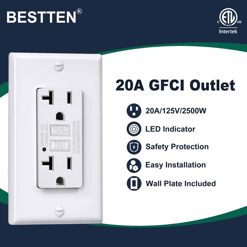 - Test and Reset buttons allow for regular tests. 20A/125V/2500W. ETL certified. For the best match use with BESTTEN USWP4 Series wallplates